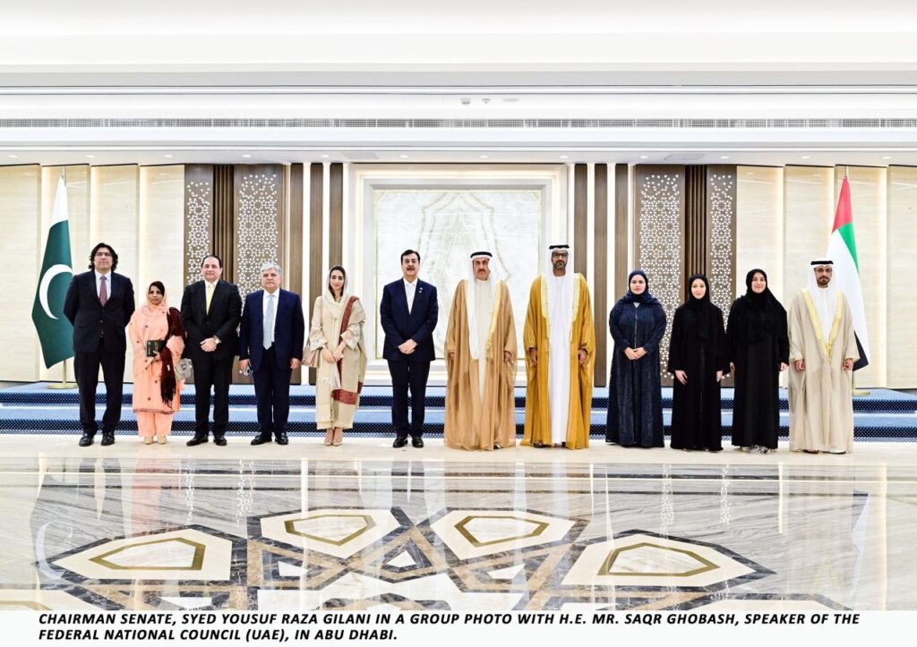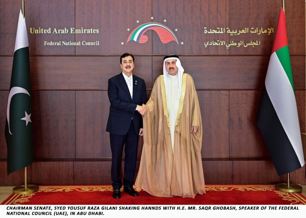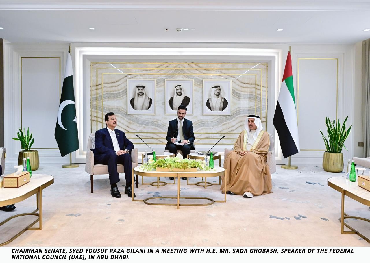 Chairman of the Senate of Pakistan, Syed Yousaf Raza Gilani, held a meeting with the Speaker of the United Arab Emirates Federal National Council, Saqr Ghobash, in Abu Dhabi, reaffirming the strong and enduring ties between the two countries.