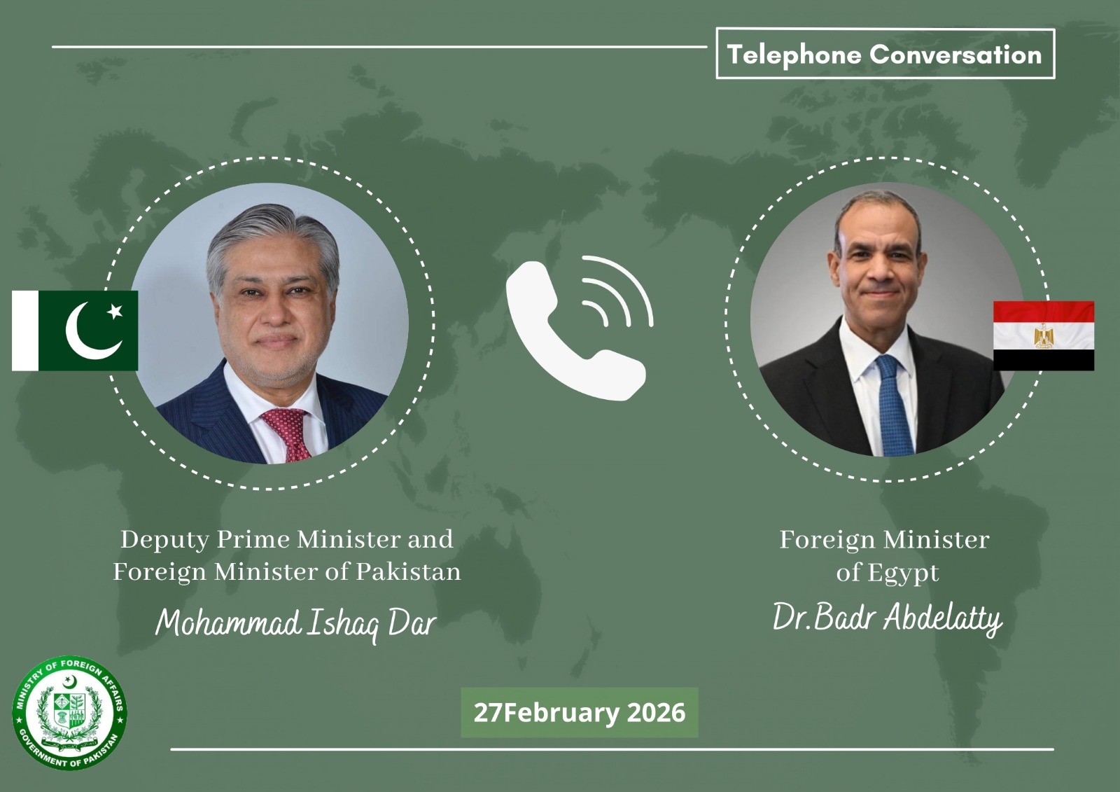 Deputy Prime Minister and Foreign Minister Senator Mohammad Ishaq Dar held a telephone conversation with Egyptian Foreign Minister Dr. Badr Abdelatty to exchange views on recent regional developments, including the situation between Pakistan and Afghanistan.