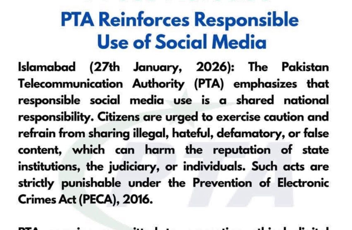 Islamabad : The Pakistan Telecommunication Authority (PTA) has emphasized that responsible use of social media is a shared national responsibility. Citizens are urged to exercise caution and refrain from sharing illegal, hateful, defamatory, or false content that could damage the reputation of state institutions, the judiciary, or individuals.