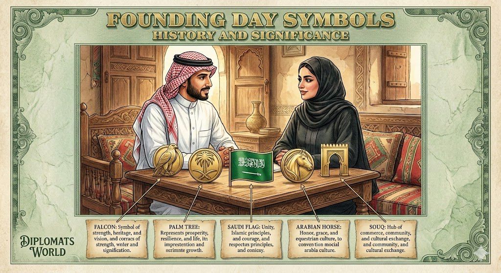 Beyond official ceremonies and celebrations, the visual emblems associated with Founding Day present a deeper narrative. The five core symbols the green flag, the palm tree, the Arabian horse, the traditional souq, and the falcon form a cohesive visual language that reflects resilience, continuity, and state-building in a challenging landscape.