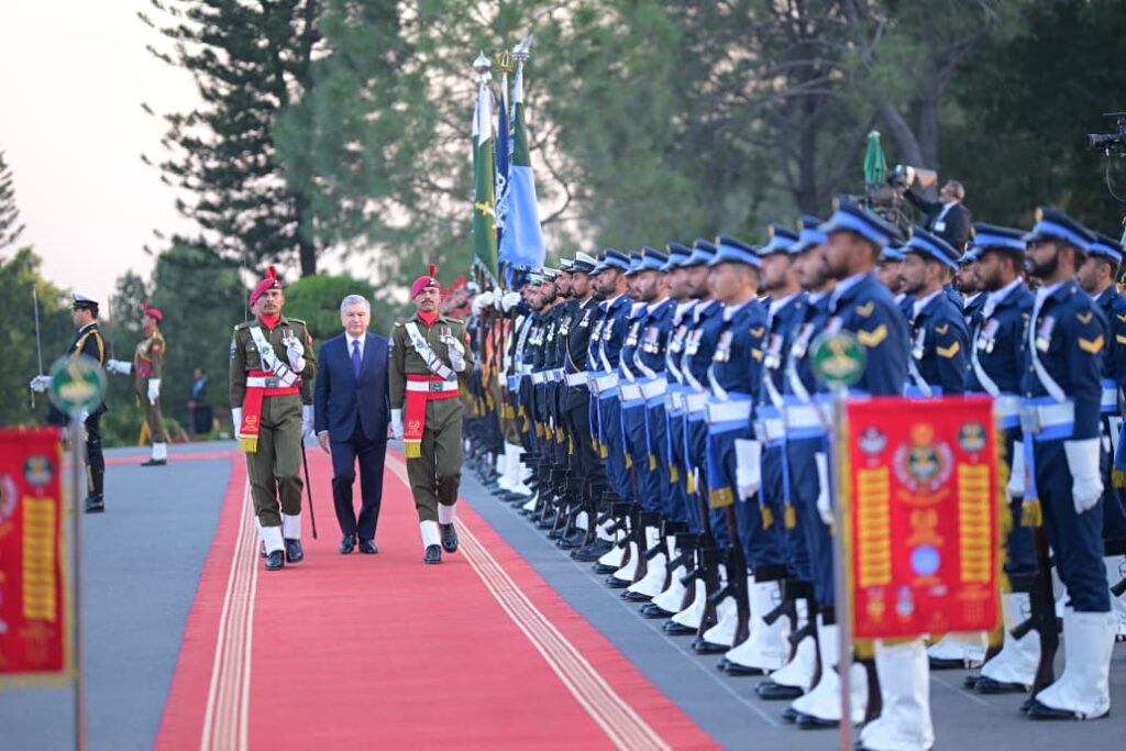 The national anthems of Uzbekistan and Pakistan were played as both leaders stood on the saluting dais. A smartly turned-out contingent representing all three services of the Pakistan Armed Forces presented a guard of honour, which President Mirziyoyev reviewed.